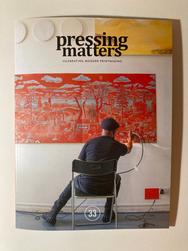 Very exciting to have mu work ‘Fragmentation’ selected for the ShowCase Gallery in the latest issue of Pressing Matters magazine, THE magazine for print makers. The Showcase Gallery is a competitive process, with artists invited to submit work on a theme, for this issue, green and black ink on white paper. Always nice to see ones work in print, and a real honour to be shown in this particular publication.