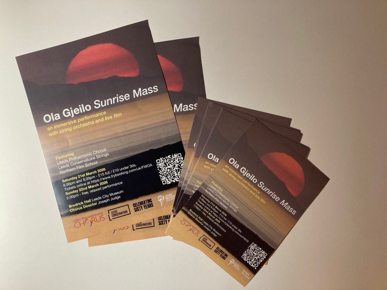 I had the opportunity just before Christmas to design a poster for the Leeds Philharmonic Chorus to promote their upcoming concert, a performance of Ola Gjeilo’s Sunrise Mass. This was a competition and I was delighted to find out early in the New Year that I’d won. And, the printed posters arrived home this week, always nice to see one’s work in print. The prize included a season ticket to all of the Chorus’s performances this year, so I may well go and see both performances on Saturday 21 March. The singing will be accompanied by a film produced by the Northern Film School, also part of Leeds Becket University, so a nice bit of synergy there too.