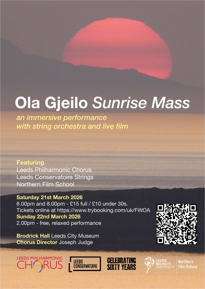 I had the opportunity just before Christmas to design a poster for the Leeds Philharmonic Chorus to promote their upcoming concert, a performance of Ola Gjeilo’s Sunrise Mass. This was a competition and I was delighted to find out early in the New Year that I’d won. And, the printed posters arrived home this week, always nice to see one’s work in print. The prize included a season ticket to all of the Chorus’s performances this year, so I may well go and see both performances on Saturday 21 March. The singing will be accompanied by a film produced by the Northern Film School, also part of Leeds Becket University, so a nice bit of synergy there too.
