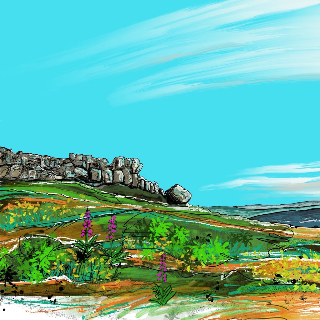 Cow and calf rocks, Ilkley – June. Digital painting. Greetings card, blank inside for your message, complete with envelope. Size 15 x 15 cm. Price £3