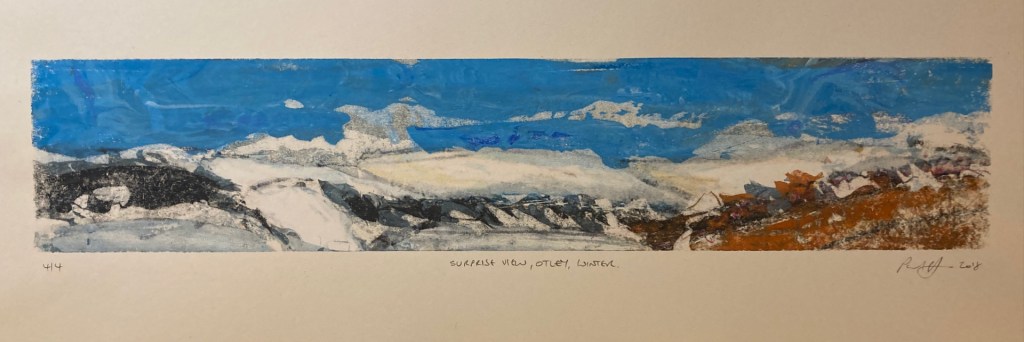 Surprise View, Otley, Winter – screen print. 4 of 4 varied edition. Print area 42 x 8 cm. Paper size 59 x 29 cm. Price £90