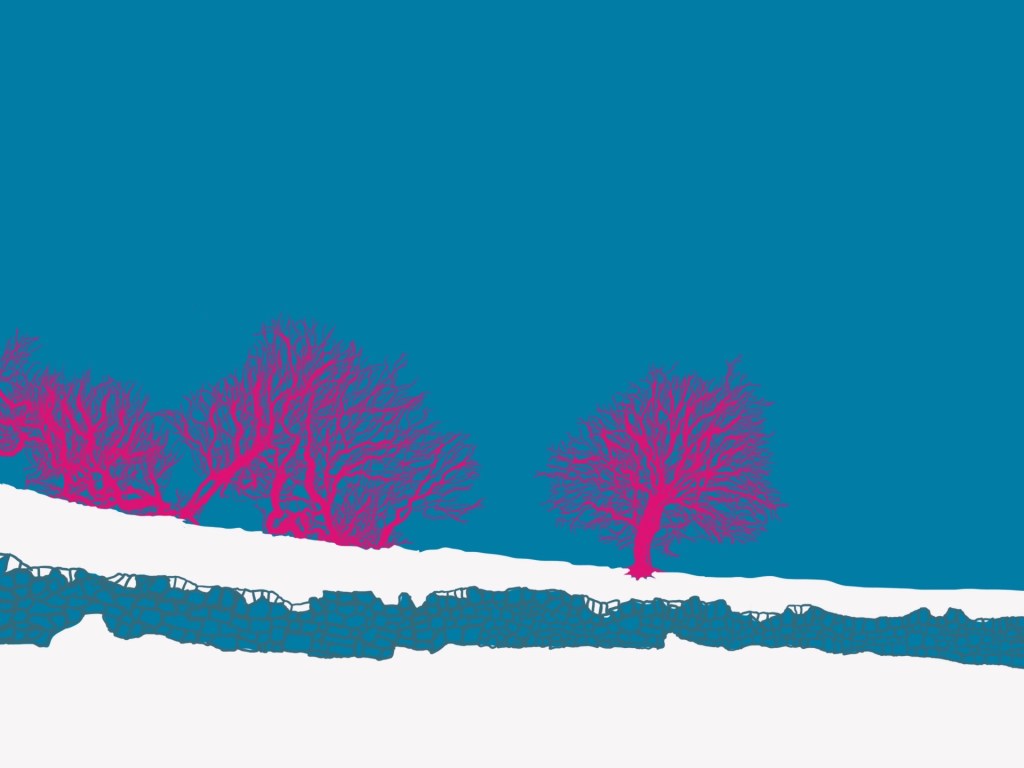 Winter Hawthorns, Otley Chevin (pink & blue design). Digital painting. Greetings card, blank inside for your message, complete with envelope. Size 17.5 x 12.5 cm. Price £3