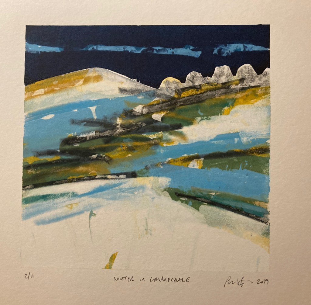 Winter in Wharfedale – screen print. 2 of 11 varied edition. Print area 15 x 15 cm. Paper size 24 x 24 cm. Price £30